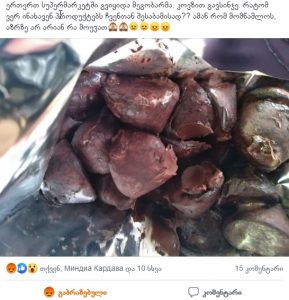 “ერთერთ სუპერმარკეტში გვიყიდა მეგობარმა. კოვზით გავსინჯე. რატომ ვერ ინახავენ პროდუქტებს ჩვენთან შესაბამისად?? ამან რომ მომწამლოს, აზრზე არ არიან რა მოუჳათ”-წერს სოციალურ ქსელში ნ.ბ