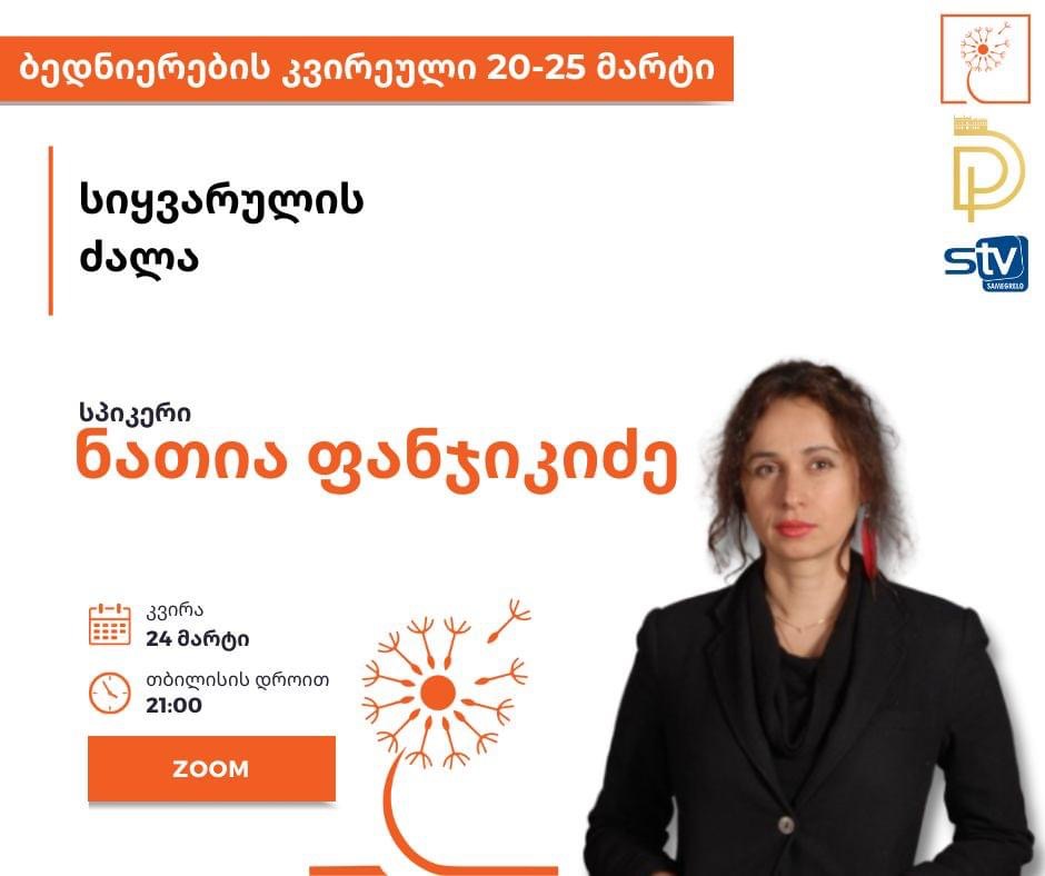 ვებინარის სპიკერები: 20 მარტი, 21:00 საათზე, გიგი თევზაძე, ფილოსოფოსი, 4D კვლევითი ინსტიტუტის დირექტორი. თემა: სახელმწიფო და ბედნიერების შესაძლებლობა: შკალის პარამეტრები; 21 მარტი, ნინი ჭაჭია, პრაქტიკოსი ფსიქოლოგი, ფსიქოთერაპევტი, სერთიფიცირებული ქოუჩი, კრიტიკული აზროვნების სკოლის დამფუძნებელი, NLP ტრენერი, თემა: ადამიანის ბედნიერების საფუძველი ანუ ბედნიერების ალქიმია; 22 მარტი, 21:00 საათზე, ზურა მხეიძე,ფსიქოლოგი, ბედნიერების განცდა და ბედნიერება, როგორც აზროვნების სახე; 23 მარტი 21:00 საათზე, ცირა ბარბაქაძე, ენათმეცნიერი, სემიოტიკის კვლევითი ცენტრის დირექტორი, თანამედროვე რიტორიკის აკადემიის დამფუძნებელი, ფილოლოგიის დოქტორი, თემა: ბედნიერების მეტაფორები; 24 მარტი, ნათია ფანჯიკიძე, ფსიქოლოგი, თემა: სიყვარულის ძალა; 25 მარტი, არქიმანდრიტი დოროთეყურაშვილი, თემა: სიცოცხლის არსი – არასობიდან არსებაში სიცოცხლე.