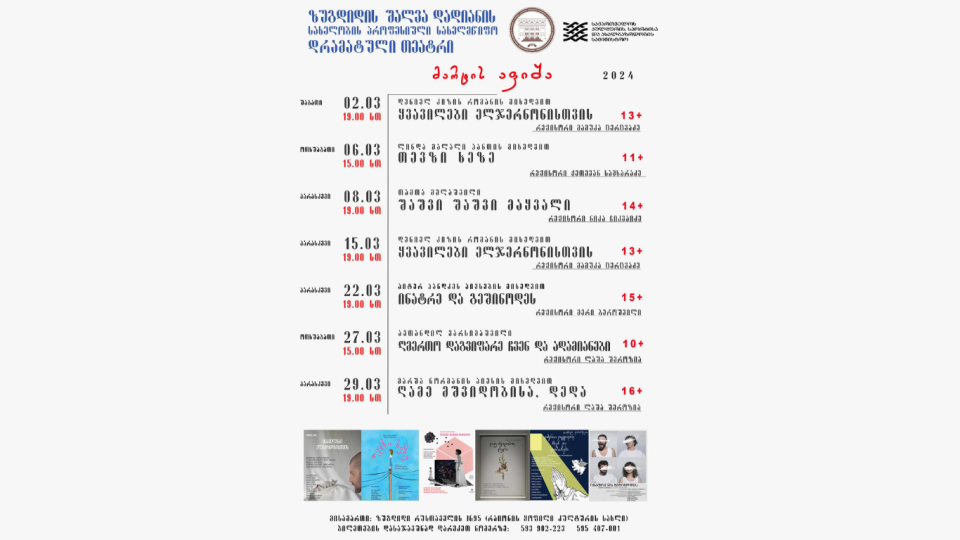 გთავაზობთ, ზუგდიდის შალვა დადიანის სახელმწიფო დრამატული თეატრის ტებერვლის აფიშას