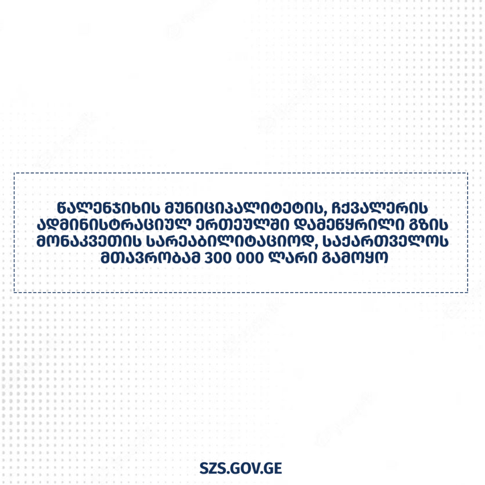 წალენჯიხის მუნიციპალიტეტის ჩქვალერის ადმინისტრაციულ ერთეულში დამეწყრილი გზის მონაკვეთის სარეაბილიტაციოდ, საქართველოს მთავრობის განკარგულებით გამოიყო 300 000 ლარი. პროექტი ორ ეტაპიანია – მიმდინარე წელს მოხდება აღნიშნული თანხით გათვალისწინებული სამუშაოების შესრულება, პროექტის მეორე ეტაპი კი 2024 წელს დასრულდება. პროექტის მთლიანი ღირებულება 1 676 100 ლარს შეადგენს.