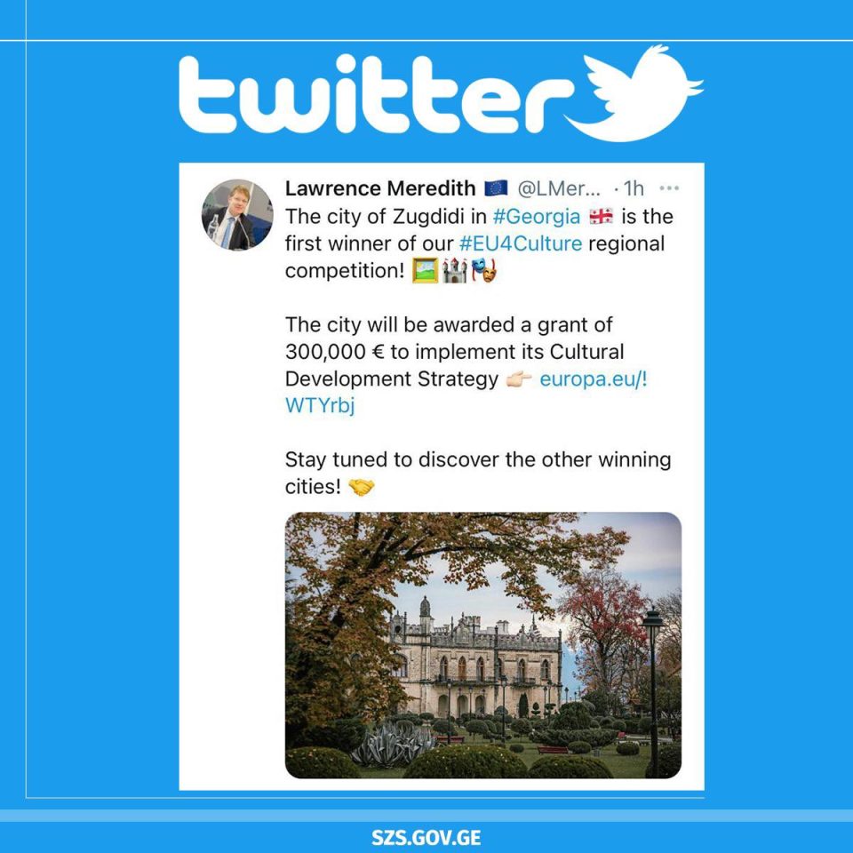 ევროკომისიის აღმოსავლეთ სამეზობლოსთან ურთიერთობასა და ინსტიტუციური მშენებლობის საკითხებში დირექტორი ლორენს მერედიტი, ზუგდიდის მუნიციპალიტეტის მიერ ევროკავშირის პროექტ EU4Culture-ის საგრანტო კონკურსში გამარჯვებას ტვიტერის ოფიციალურ გვერდზე ეხმაურება:
