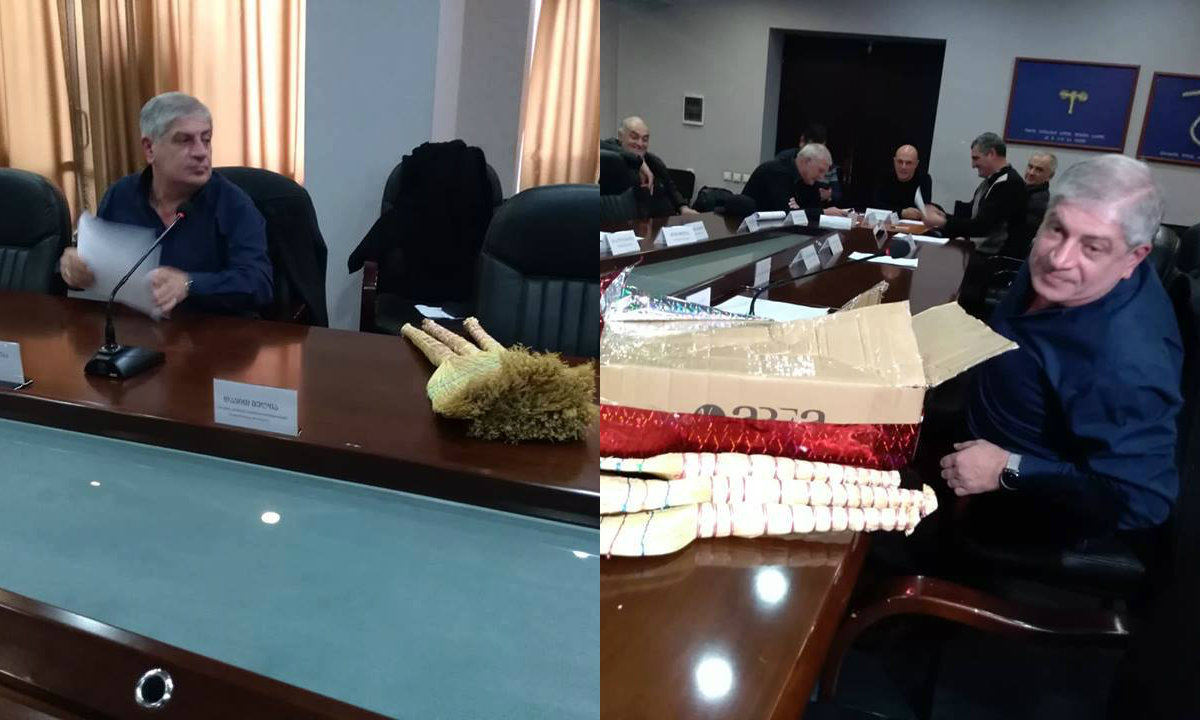 ზუგდიდის მუნიციპალიტეტის საკრებულოს თავმჯდომარის მოადგილე თაზო ფაცაციამ ფრაქცია „ნაციონალური მოძრაობის“ წევრს, პაატა ადამიას სხდომაზე საჩუქრად ცოცხები გადასცა.