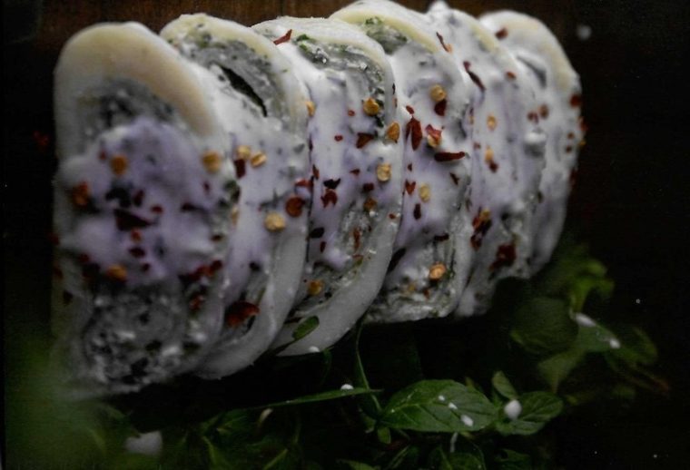 გაასუფთავეთ პიტნის ფოთლები, დაკეპეთ, დაუმატეთ წვრილად დაჭრილი ქინძი, დაღერღილი წიწაკა და მარილი გემოვნებით. ყველის გაბრტყელებულ ფირფიტას გადაუსვათ მიღებული მასა (ნაწილი მოიტოვეთ სოუსისთვის) და გადაახვიეთ რულეტივით, ასე დატოვეთ გაციებამდე.
